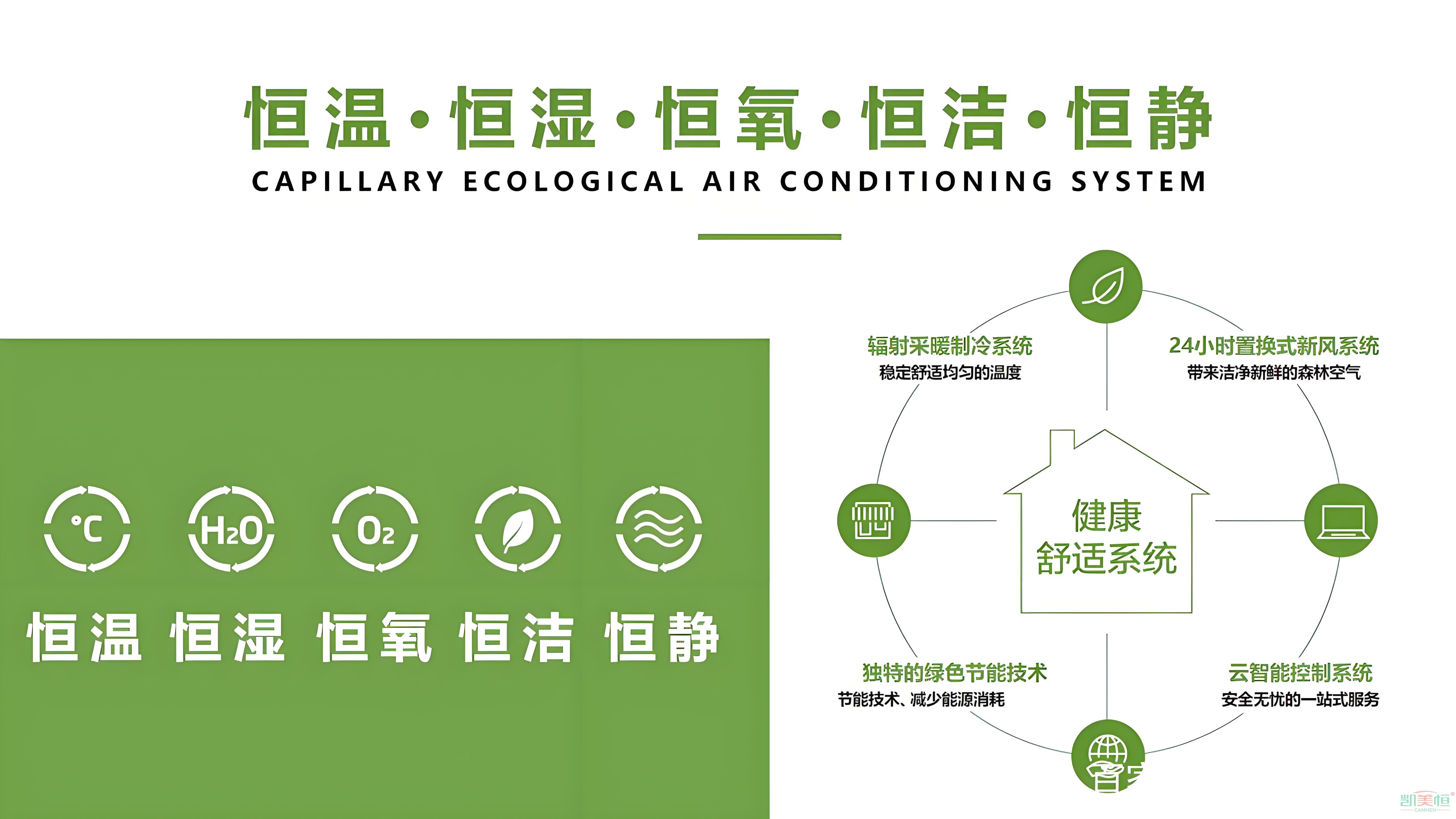 指的是通過毛細管網輻射系統和高效可熱回收的新風系統控制室內的溫、濕度和空氣的潔凈度,核心理念“以節能為基礎,以智慧控制為核心,以舒適健康為目標”,進而使房間內24 小時內保持恒溫、恒濕、恒氧、恒潔、恒靜的效果。